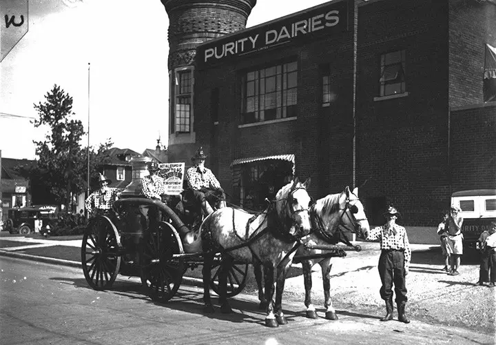 MYSTERY STEAMER – This interesting photo was taken sometime in the 1930s as Windsor’s annual Labor Day parade formed up. After marching down Ouellette Ave., the parade concluded at Jackson Park, where the Windsor Fire Fighters Field Day was under way. The Windsor Fire Department’s novelty entry was sponsored by Purity Dairies. The photo was taken on Shepherd St. just west of Howard Ave. The former Purity Dairies building with its distinctive cylindrical corner tower is still there today.